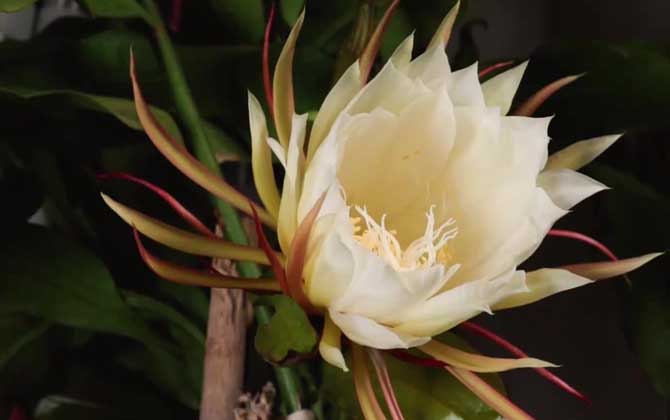 4、昙花是附生肉质植物,应及时搭建和更换攀爬架,以防攀爬架腐烂造成植株倒伏。